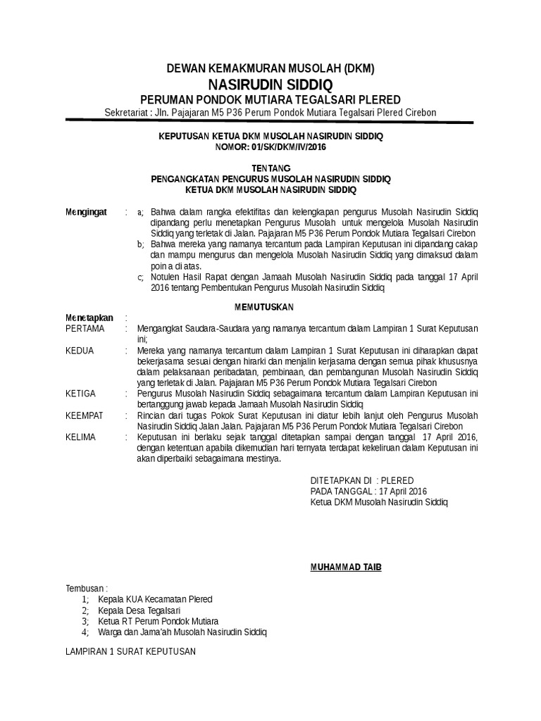 0 response to contoh sk dkm bkm post a comment silahkan berkomentar. Perbedaannya ada pada judul, isi keputusan dan lampiran. Pengangkatan kepengurusan masjid al amin desa pedindang. 5 contoh sambutan ketua panitia ketua osis dan perpisahan. Pengurus dkm contoh sk pengurus masjid 2019 guru ilmu sosial. Contoh sk pengangkatan ketua dkm masjid guru ilmu sosial. Masjid baitul jannah rw 022 perum permata tangerang sk pengurus dkm periode 2017 2020. Surat keputusan ketua yayasan pendidikan gideon no. Pembuatan sk perangkat masjid dari kepala desa sama dengan format contoh sk imam masjid yang telah dibahas sebelumnya. Musyawarah bersama ketua dkm jami nuraeni dan pengurus serta masyarakat babakan memperhatikan : Contoh pidato sambutan panitia kegiatan bulan ramadhan cuitan dokter. Surat keputusan pengangkatan kepengurusan masjid al amin desa. Doc sk pengurus masjid ar rahiim arif soleh academia edu.