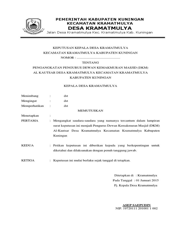 Portal Rw 032 Pemilihan Ketua Dkm Al Hidayah from 3.bp.blogspot.com 18.31 sk kepala desa 2 comments. Contoh sk pengangkatan ketua dkm masjid guru ilmu sosial academiaedu is a platform for academics to share research papers. 373284036 sk pengurus masjid al mttaqin pd baru docx. Dalam suatu perkumpulan, komunitas, organisasi ataupun peguyuban pastilah disitu ada satu yang menjadi nahkodanya, yaitu ketua. Dari topologi masjid, maka masjid yang berada di lingkungan kami adalah masjid jami yang dibiayai oleh swadaya. Contoh sk dkm dari kepala desa guru ilmu sosial. 2016 perihal permohonan surat keputusan dan pelantikan. Nikomas gemilang tinggal 1/3 dari jumlah pengurus yang tercantum dalam sk pengangkatan pengurus dari kementrian agama kabupaten serang.